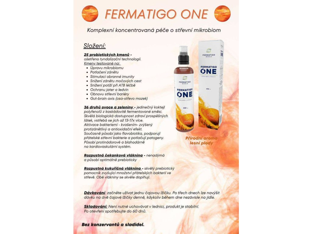 Fermatigo ONE je moderní doplněk stravy, který v sobě spojuje sílu 25 probiotických kmenů ošetřených tyndalizační technologií, 36 druhů fermentovaného ovoce a zeleniny a rozpustnou vlákninu. Tento jedinečný komplex je vytvořen pro podporu zdravého střevního mikrobiomu, udržení vnitřní rovnováhy a přirozené pročištění organismu.